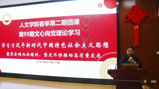 3月21日下午,人文学院团委、学生会组织开展了“文心向党”理论学习。本次学习以“聚焦两会精神,坚定不移推动高质量发展”为主题,由团委书记杨紫金老师领学,人文学院团委、学生会全体成员参加会议。通过此次会议,同学们深刻领会了全国两会精神的核心要义,进一步明晰了高质量发展的时代要求与青年责任,切实增强了为强国发展贡献青春力量的思想自觉与行动自觉。