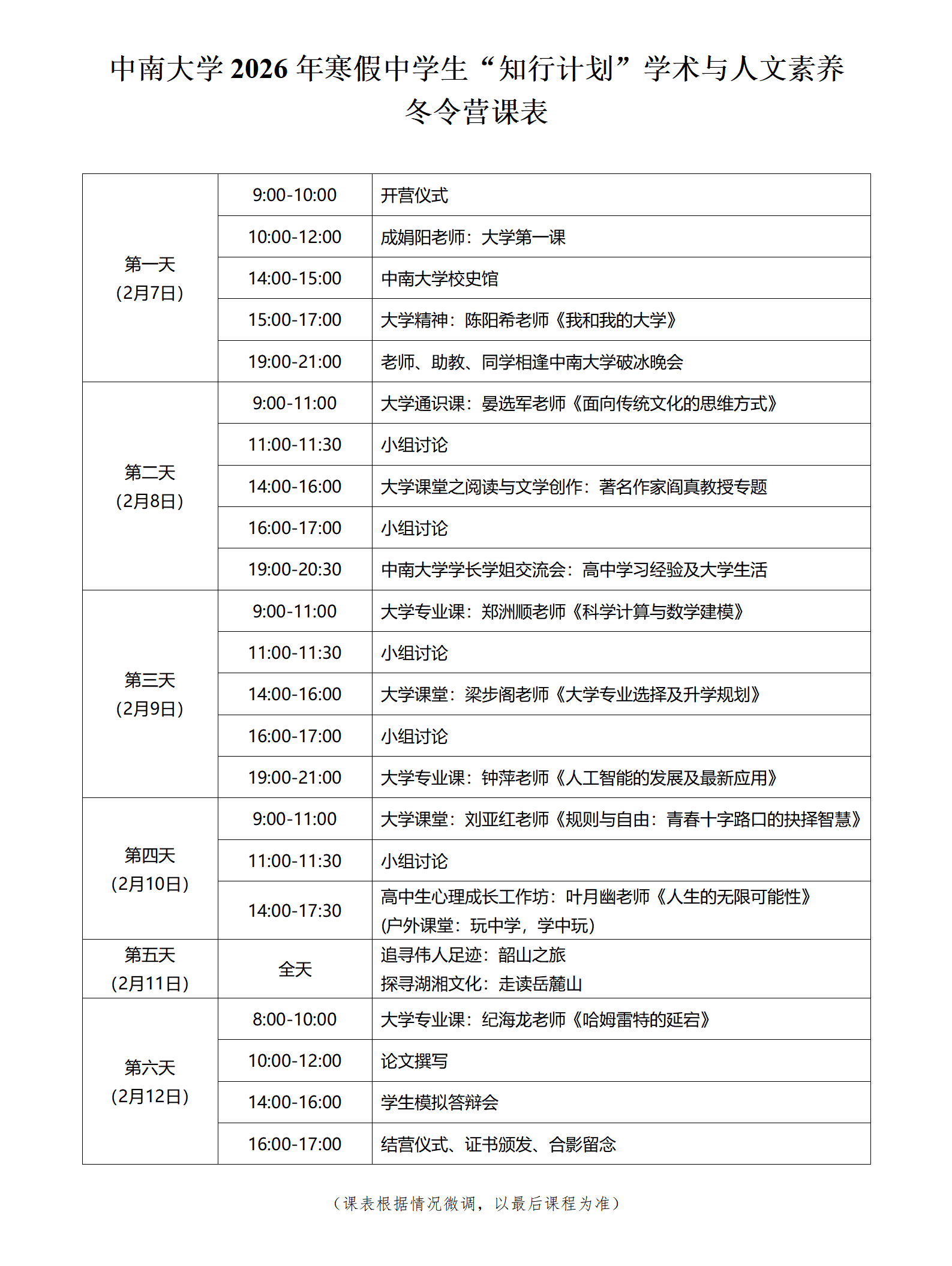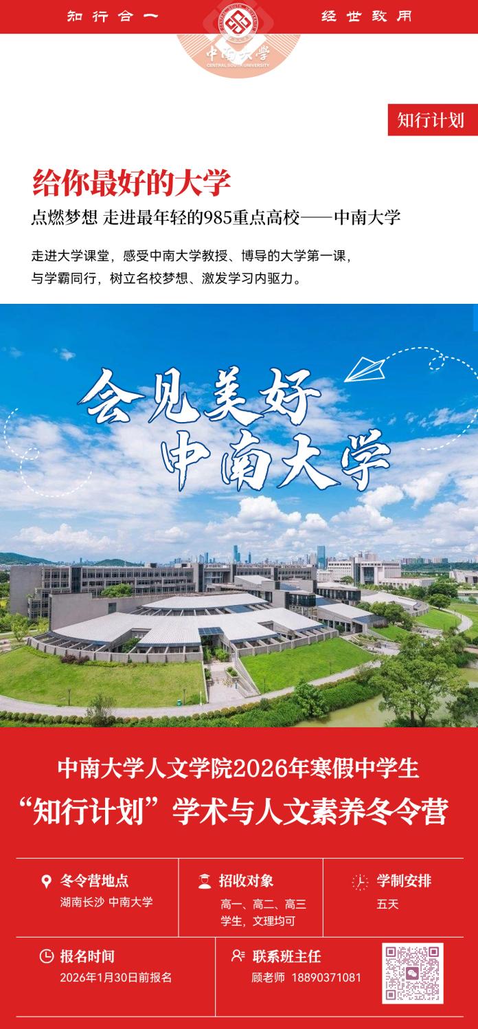 中南大学坐落在中国历史文化名城——湖南省长沙市,占地面积317万平方米,跨湘江两岸,依巍巍岳麓,临滔滔湘水,是求知治学的理想园地。中南大学是国家“211工程”首批重点建设高校,教育部直属“985工程”高水平大学,世界一流大学A类建设高校。为让中学生能提前浸润大学本科学习和学术研究氛围,激发中学生对大学课堂及学术前沿探索的兴趣和热情,中南大学举办2026年寒假中学生“知行计划”学术与人文素养冬令营,面向全国招收优秀高中生。