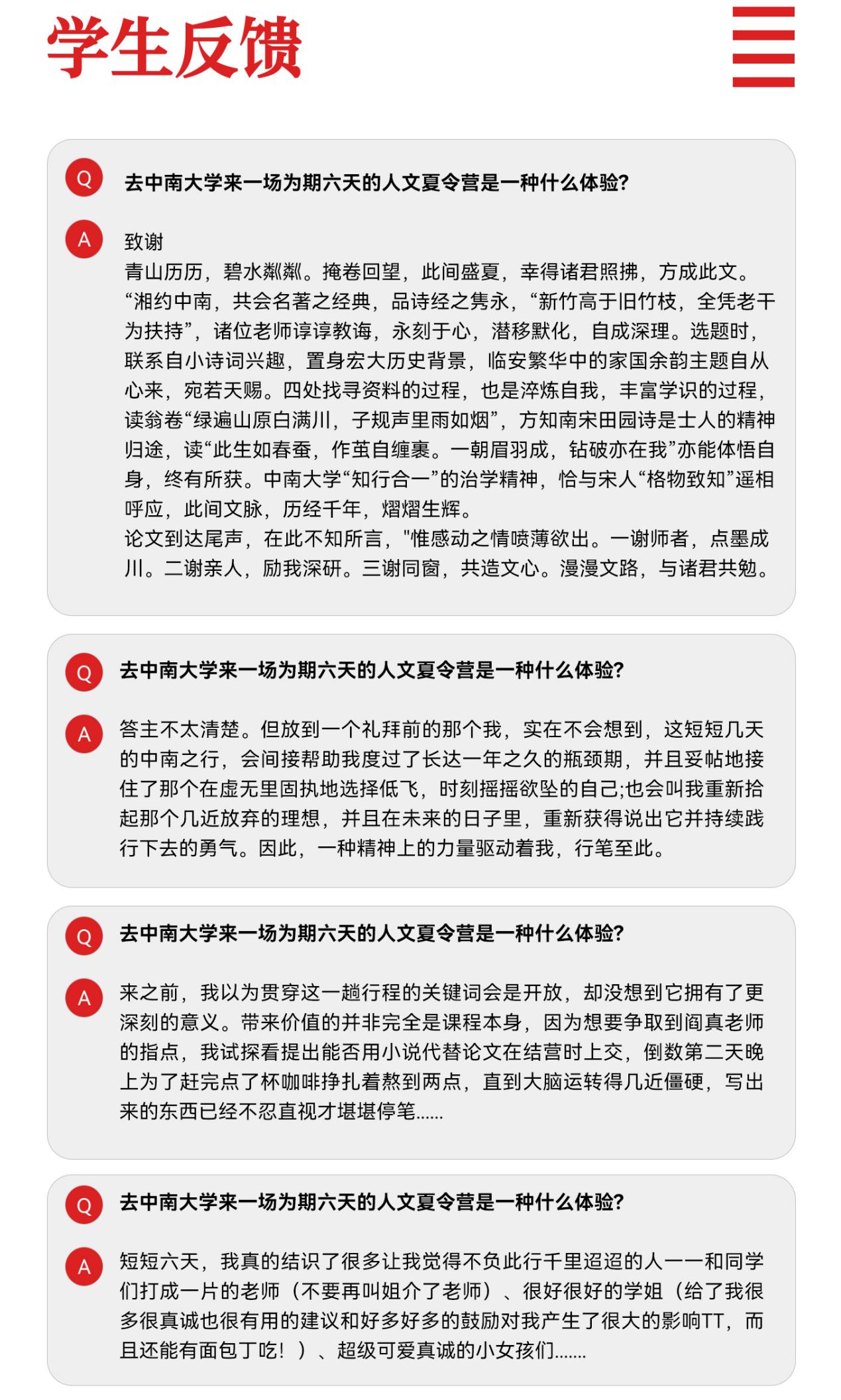 本期冬令营,中南大学人文学院、自动化学院、计算机学院、数学与统计学院的教授联袂授课,学生们将走进“最年轻”的985重点大学,感受“经世致用,知行合一”的中南大学校训,了解学术前沿,在导师组指导下学习和体验论文撰写与答辩过程,让学生收获人生第一份研究成果。