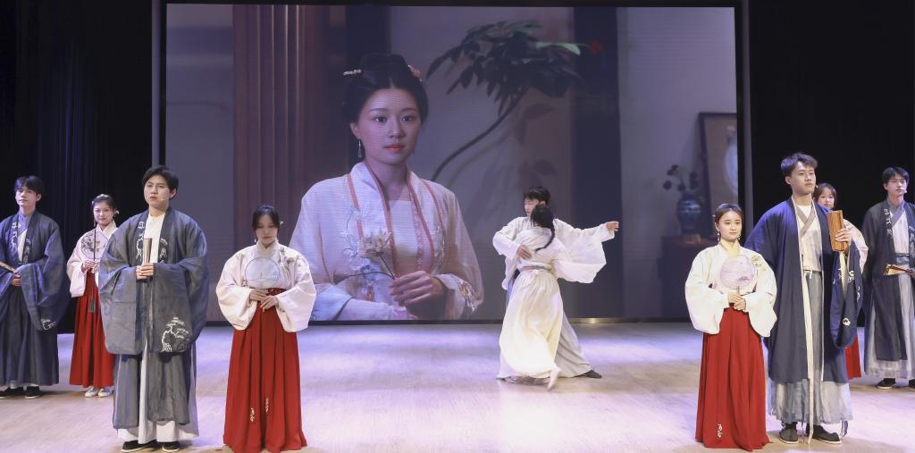 中华经典吟唱团本次参赛节目《一剪梅》巧妙融合了吟唱、朗诵、舞蹈以及古筝与竹笛的伴奏等元素。节目的背景视觉由中南大学“AI-LLM”李清照项目特别制作,整体舞美与情感表达由人文学院学生基于课堂所学,深入解读李清照生平与词作意境后设计完成。