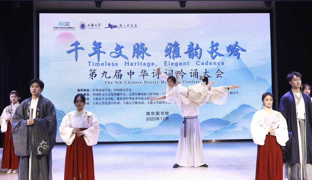 2025年11月14日下午,第九届中华诗词吟诵大会在南京图书馆圆满落幕。中南大学中华经典吟唱团选送作品《一剪梅》(红藕香残玉簟秋)在本次比赛中荣获一等奖。中南大学荣膺大会“最佳组织奖”,杨雨教授、唐苗老师被授予“优秀指导老师”荣誉称号。