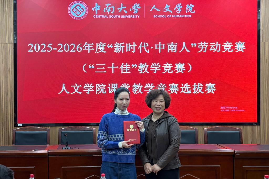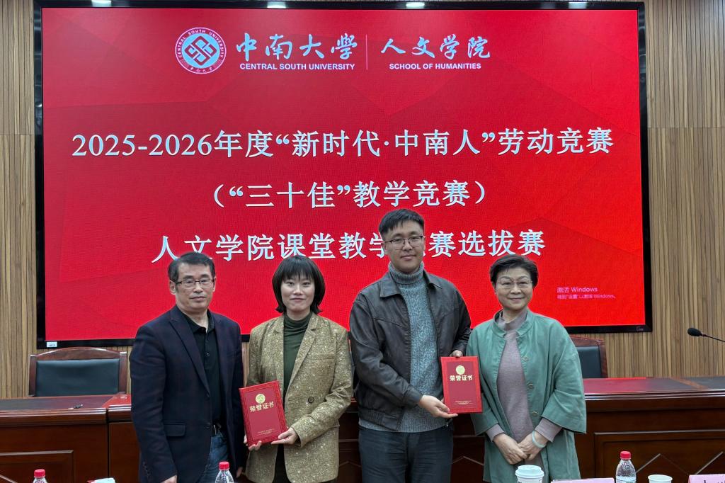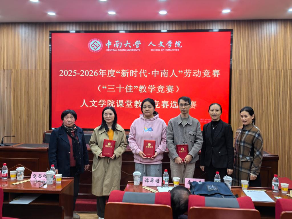 此次竞赛共评选出一二三等奖共6名,余慕怡老师获一等奖,姜瑀、李亚东老师获二等奖,贺予飞、陈文波、卿胜蓝老师获三等奖,他们将代表人文学院参加学校2025-2026年度“新时代·中南人”劳动竞赛(“三十佳”教学竞赛)。未来,人文学院将持续以教学竞赛为抓手,完善教师培养机制,为学校教育教学事业高质量发展注入强劲动力。