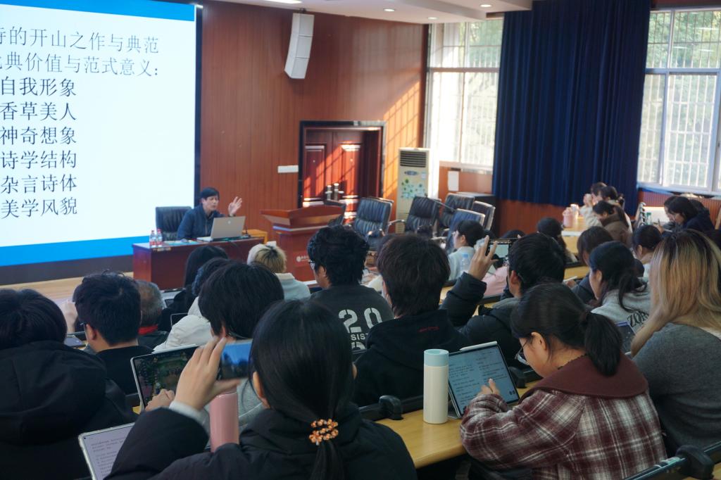随后,吴广平教授从六大维度,系统剖析了《离骚》的元典价值与范式意义。其一为高大俊洁的自我形象,他结合经典诗句与趣味典故,指出了屈原“廉洁、纯粹、耿介、清白”的道德追求,以及“求索、爱国、献身”的不朽精神,凸显屈原可与日月争光的人格魅力;其二是芬芳华美的香草美人,吴广平教授详细解读了香草在诗中的多重象征,以及美人意象的独特表达体系;其三为超越时空的神奇想象,他指出诗中塑造了极具浪漫主义色彩的文学境界;其四是宏大精妙的诗学结构,吴广平教授为大家介绍了《离骚》的奇特构思,体现诗中实与虚、生与死的艺术交响;其五为参差错落的杂言诗体,他从《诗经》的四言定式切入,引出《离骚》涵盖一言至九言多种句型,通过介绍屈原对语气词的精巧运用,突出其在诗歌创作方面的极高天赋;其六是弘博丽雅的美学风貌,吴广平教授引经据典,对《离骚》中经典名句进行解析,强调屈原的作品是宏大的、广博的、美丽的。